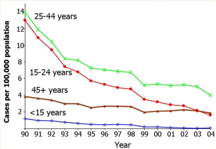 The greatest decline in hepatitis B cases was among those in the 20 and 30 year age groups (blue bars) with the greatest proportional decline occurring among the age group 15–24 years (87% decline). These are the age groups that are most active and engaged in the riskiest behaviors known to cause contraction of hepatitis B virus infection.