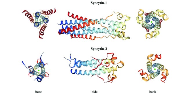 This structure of the syncytins is the same as that described for the SARS-CoV-2 spike protein, also a class 1 fusion protein; the S1 subunit of the spike binds to the receptor and then the separation between the two, the cut made by the enzyme furin from the S1 and S2 subunits, allows the virus to enter the cells.