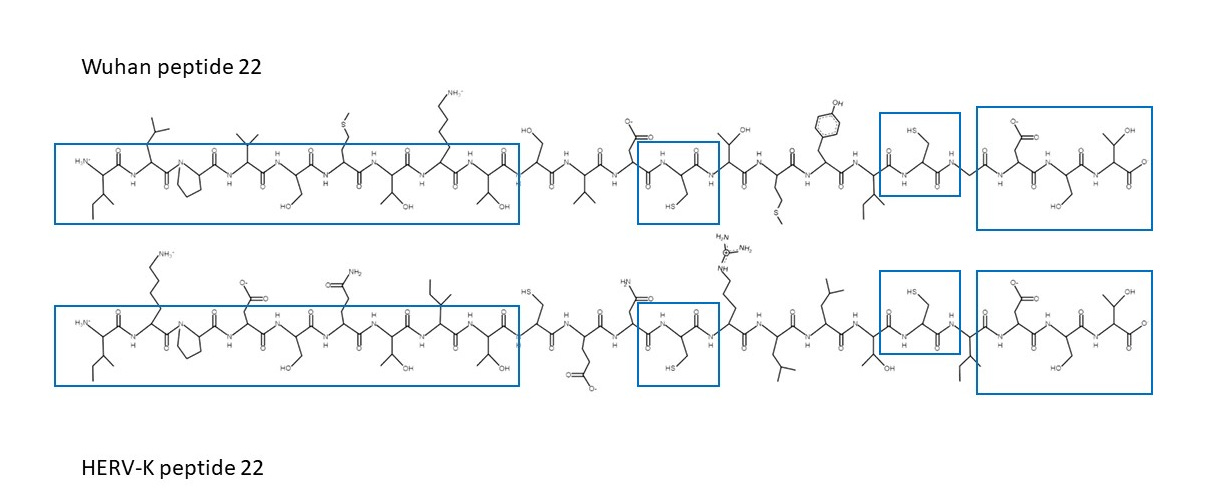 It is key to remember that proteins aren’t linear, they fold into secondary, tertiary and quaternary structures. Within the boxed regions, stereochemistry is identical. Any element of the host response that has seen the one in HERV-K would be expected to respond identically to that within SARS-CoV-2 (Wuhan peptide 22).